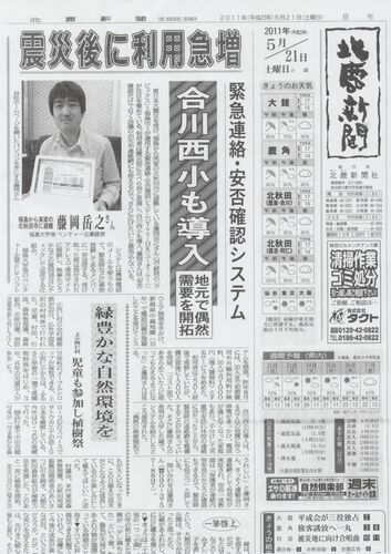 地方紙とはいえ、一面に掲載されるとは大変驚きましたが、 You-OKの導入の記事が北鹿新聞に掲載されました。 2011年5月21日北鹿新聞朝刊より 緊急時の連絡網として「あんしん連絡網 You-OK」が導入されました 4月7日に発生した地震では秋田県全体が停電しま…