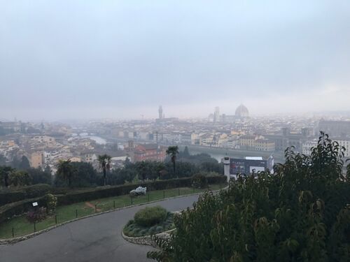 この日は、午前中はウフィッツィ美術館、午後はフィレンツェのドゥオモのクーポラに登ります。 ドゥオモってのは町に1つある大聖堂のことです。 クーポラってのはその丸天井です。 まず、高台からフィレンツェの町を臨みます 町はとても味わい深い古き良き…